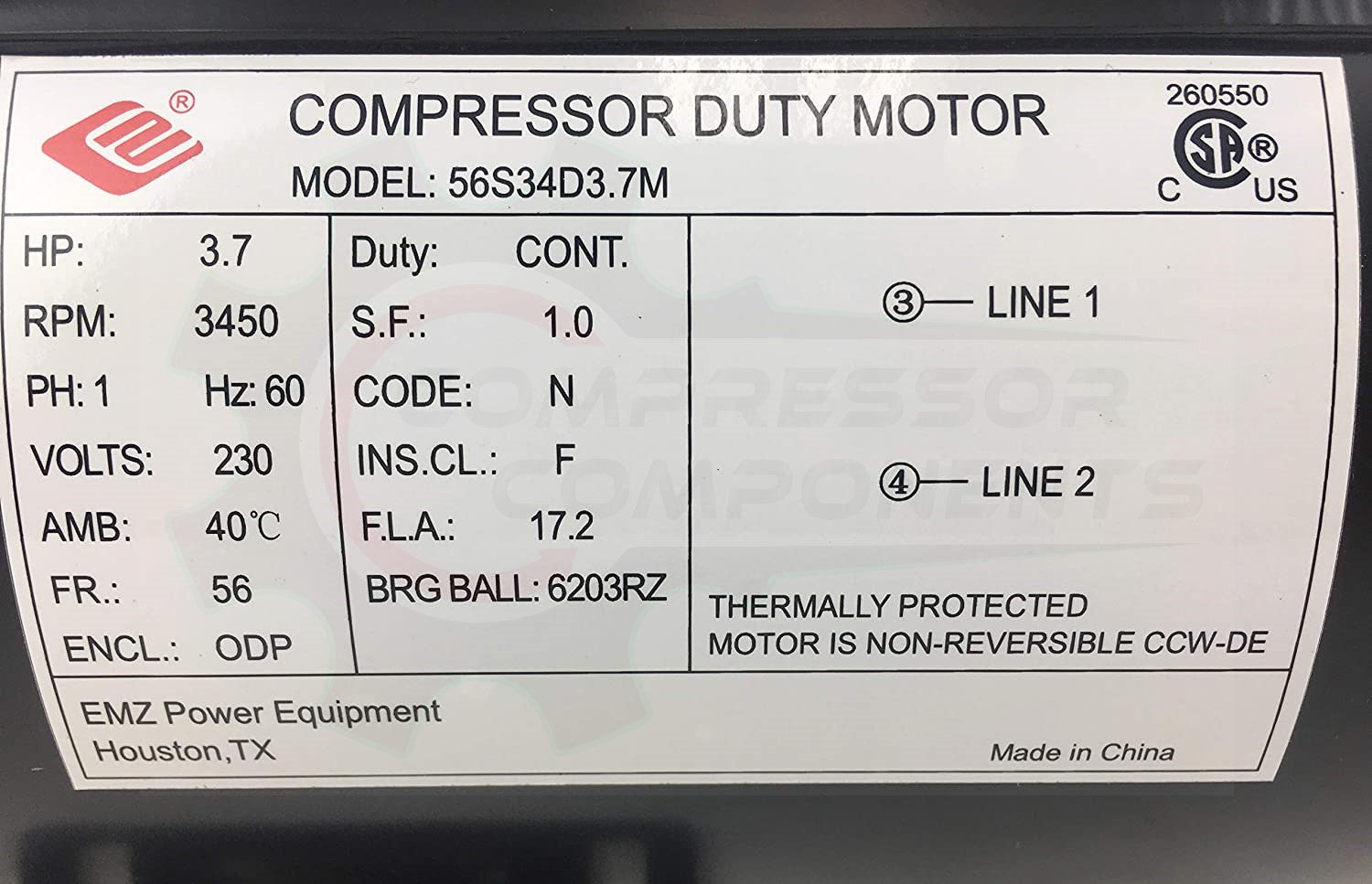 EMZ EM4-56 (5HP SPL) / 4 HP 56 FRAME 230 VOLT NON REVERSIBLE CCW Replaces Ingersoll-Rand 97016950